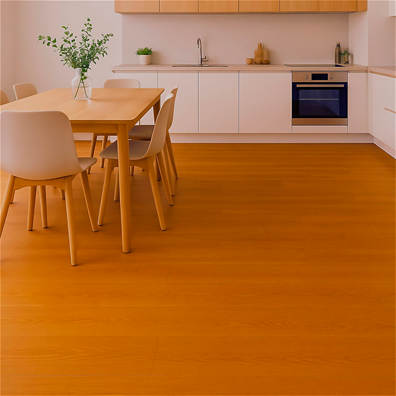 Es un piso vinílico que ya trae adhesivo integrado y se instala directamente sobre superficies lisas.