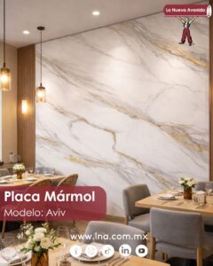 La placa tipo mármol es una excelente opción para locales que buscan una imagen elegante y actual. Se utiliza comúnmente en barras, muros principales y áreas de alto impacto visual, tanto en cafeterías como en restaurantes.